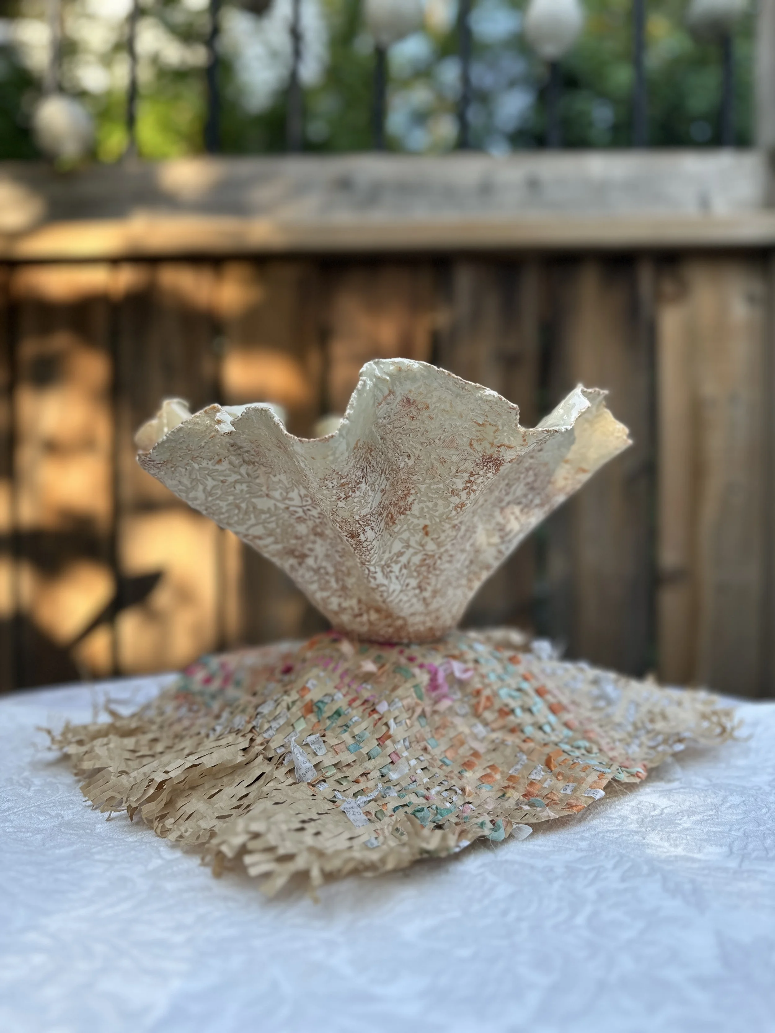 A textured and wrinkled porcelain bowl sits on a colourful woven “cloth” of paper, ribbon, and poetry scraps. “Memory Fold / Birth Place,” ©2024 Rami Schandall